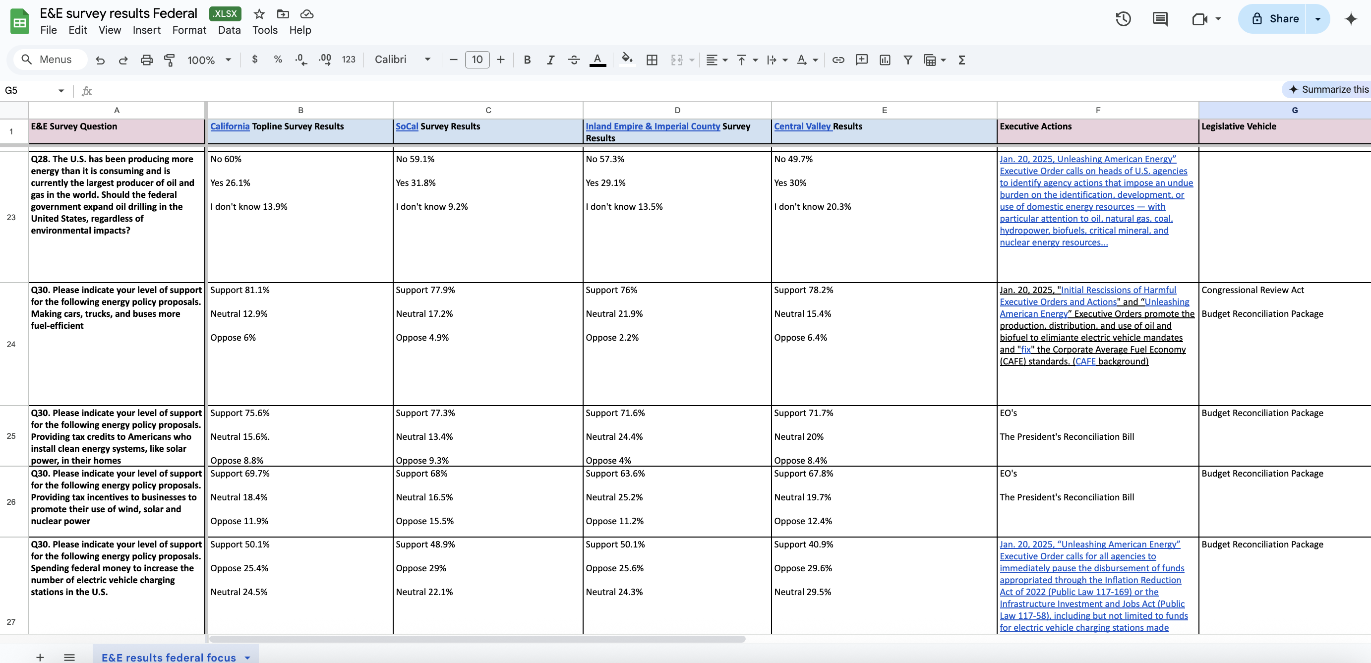 The image below shows questions from the E&E survey related to federal policies, along with it’s respective responses throughout the state and specific regions, and ties them to the executive or legislative vehicle of assault. This E&E survey results Federal hyperlink connects to a comprehensive spreadsheet containing this information.
